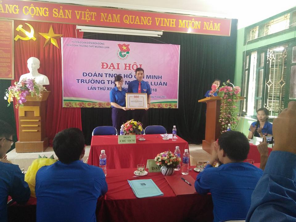 Đ/c Nguyễn Thị Hằng thay mặt đoàn cấp trên tặng giấy khen của Tỉnh Đoàn cho BCH Đoàn trường THPT Mường Luân.