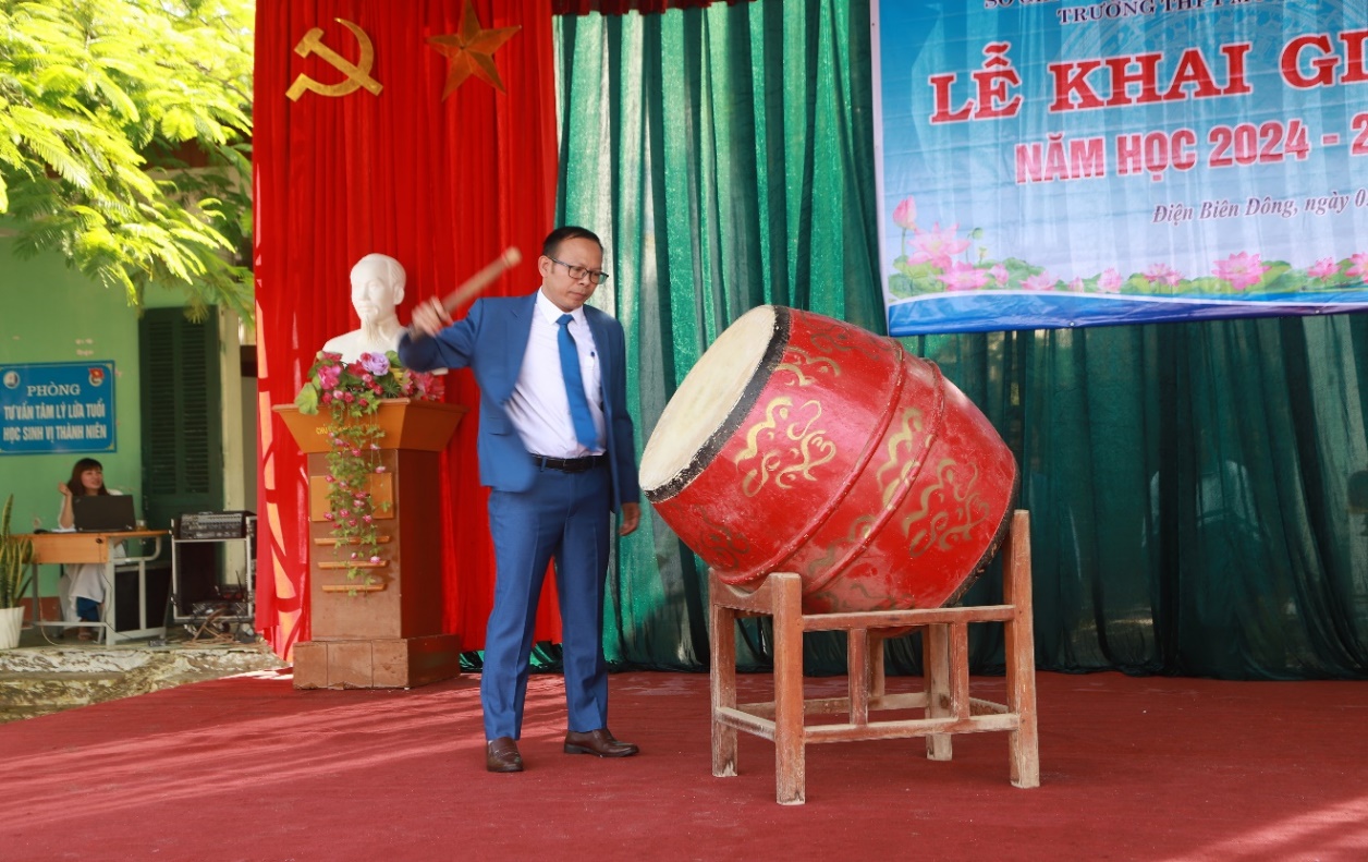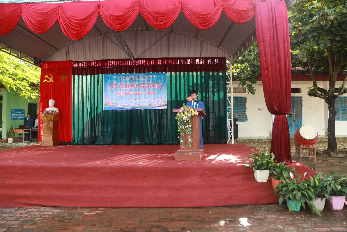 Ảnh: Thầy giáo Hà Văn Tuân – Phó bí thư Chi bộ - P.HT thông qua diễn văn Khai giảng và đánh trống khai trường năm hoc 2024 - 2025