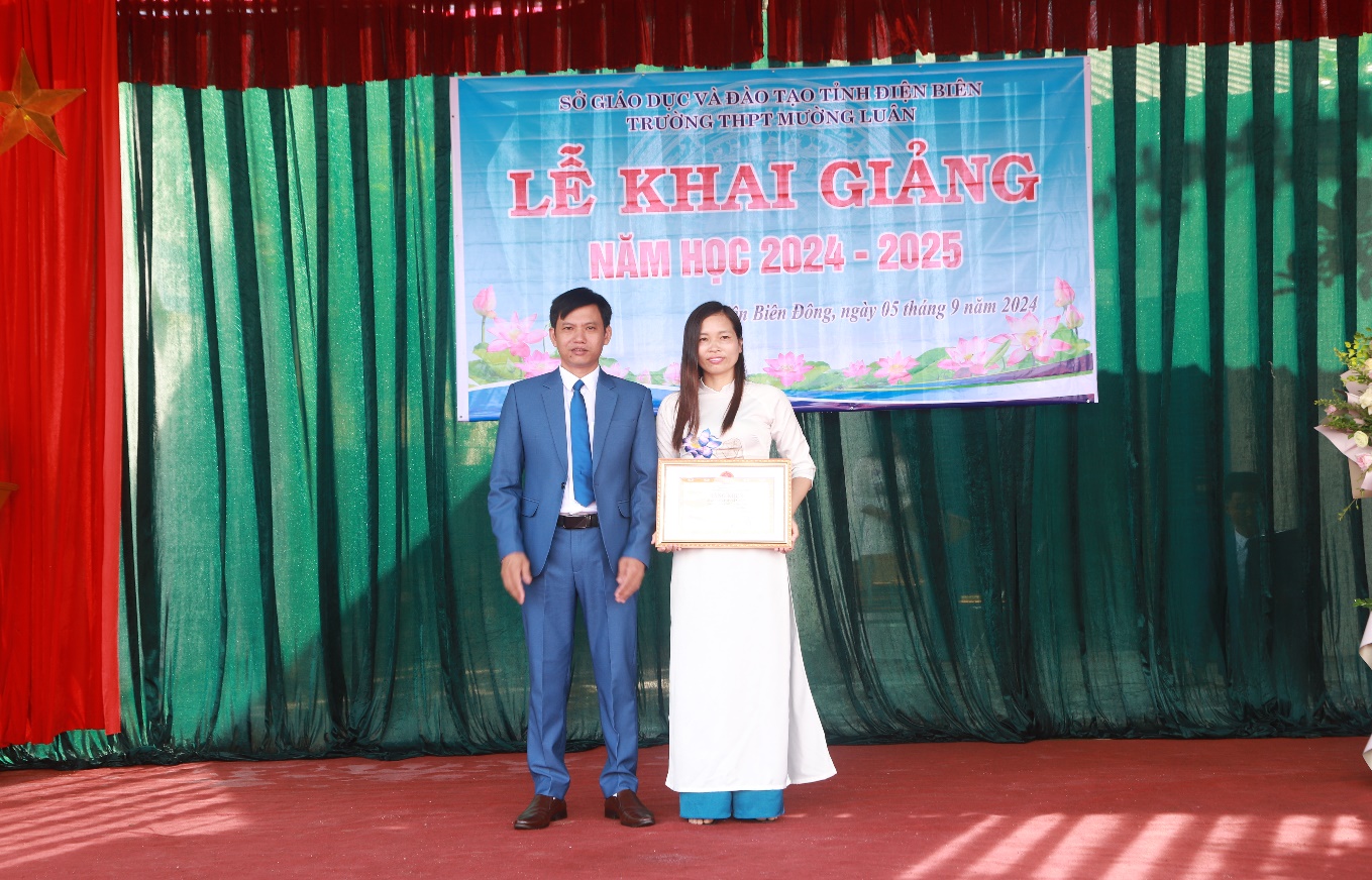 Đ/C: Vì Văn Dinh – Chi ủy viên – P. Hiệu trưởng nhà trường trực tiếp trao Bằng khen của BCH tỉnh đoàn Điện Biên cho tập thể BCH đoàn trường THPT Mường Luân đã có thành tích xuất sắc trong công tác đoàn và phong trào thanh niên trường học năm học 2023 - 2024.