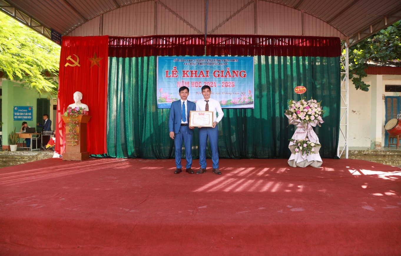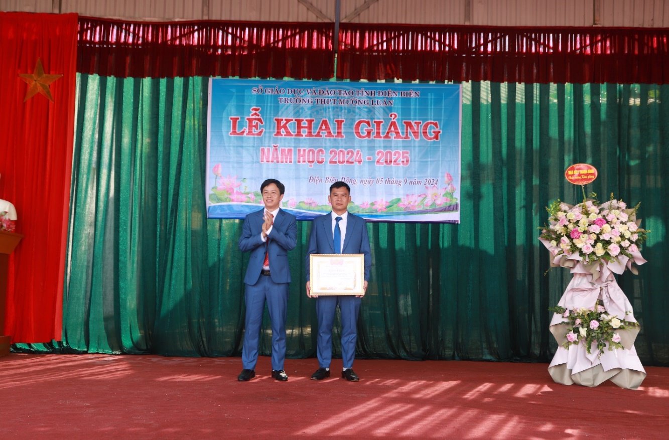 Đ/C: Trần Đình Quang – BTCB – Hiệu trưởng trực tiếp trao Bằng khen của BCH Trung ương đoàn TN cho Đ/C Vì Văn Chuẩn – Bí thư đoàn trường THPT Mường Luân đã có thành tích xuất sắc trong công tác đoàn và phong trào thanh niên trường học năm học 2023 - 2024.