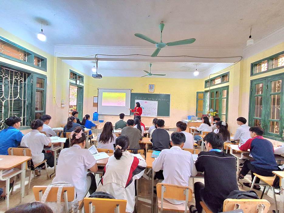 Cô Phạm Thị Hà, Phó hiệu trưởng trường THPT Thành Phố Điện Biên Phủ phát biểu tại Hội nghị Buổi sinh hoạt chuyên môn bắt đầu với 14 tiết dạy ôn thi tốt nghiệp THPT của 07 bộ môn gồm: Ngữ văn, Toán, Vật lí, Hóa học, Sinh học, Lịch sử, Địa lí do giáo viên của trường THPT Mường Luân và trường THPT Thành phố Điện Biên Phủ thực hiện. Các tiết dạy đều có sự đầu tư chu đáo cả về khâu tổ chức lẫn kiến thức, phương pháp, kỹ thuật dạy học. Học sinh chủ động tham gia các hoạt động chiếm lĩnh kiến thức, vì thế không khí giờ học sôi nổi, hào hứng, xóa tan áp lực căng thẳng về truyền thụ kiến thức một chiều. Có thể nói, đây là sản phẩm của trí tuệ tuyệt vời mà các thầy cô giáo trường THPT Thành Phố Điện Biên Phủ đã mang đến. Ngoài cách thức thiết kế linh hoạt, sáng tạo về nhiệm vụ học tập, giáo viên còn vận dụng hợp lí và có hiệu quả các phương pháp, kĩ thuật dạy học tích cực, ứng dụng công nghệ thông tin trong dạy học. Trong tiết học, học sinh được trao cơ hội chủ động học tập, khả năng sáng tạo và phản biện, vận dụng vào thực tiễn… Kết thúc hoạt động dự giờ thăm lớp, các thầy cô cùng ngồi lại rút kinh nghiệm giờ dạy trong không khí chân tình và ấm áp. Qua đó giáo viên trường THPT Thành phố Điện Biên Phủ đã nhiệt tình chia sẻ những kinh nghiệm và phương pháp giảng dạy, ôn thi TNTHPT cho giáo viên trường THPT Mường Luân giúp giáo viên nâng cao kĩ năng sư phạm đáp ứng nhu cầu đổi mới Giáo dục, nâng cao chất lượng chuyên môn, chất lượng ôn thi TNTHPT trong tình hình mới.