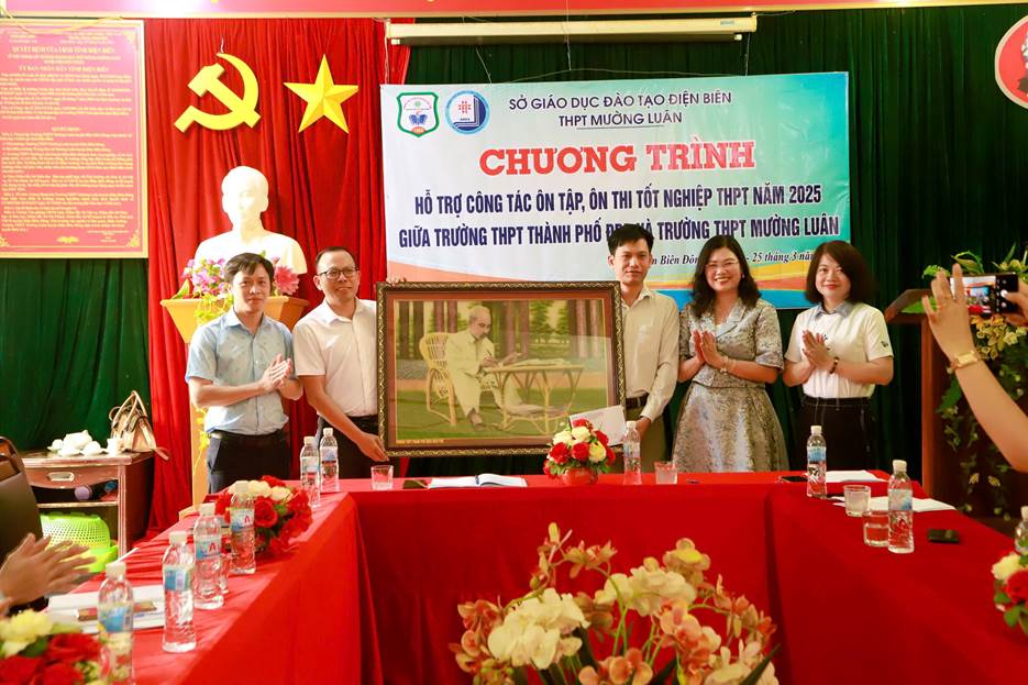 Ban giám hiệu trường THPT Mường Luân đón nhận món quà từ trường THPT Thành Phố Điện Biên Phủ