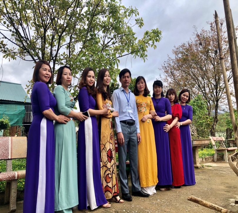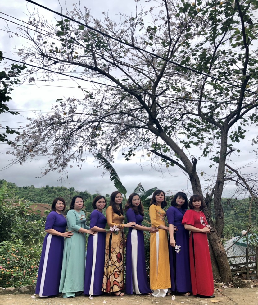 Chiếc áo dài màu đỏ điểm hoa, chiếc áo dài màu xanh lá cây tươi tắn, màu tím Huế đã làm tôn vẻ đẹp các công đoàn viên trường THPT Mường Luân trang nhã, mềm mại, tươi đẹp hơn.