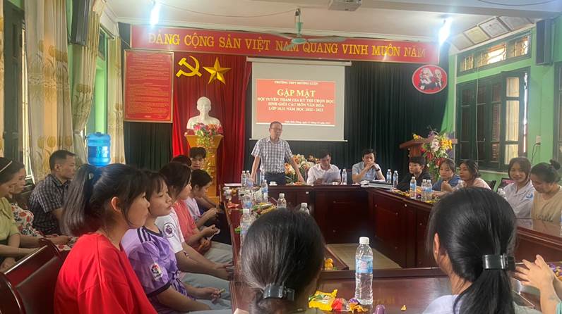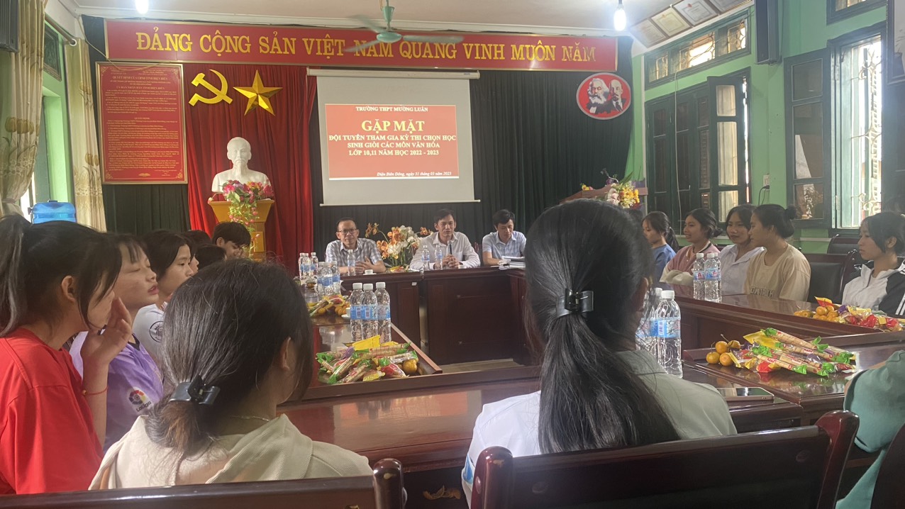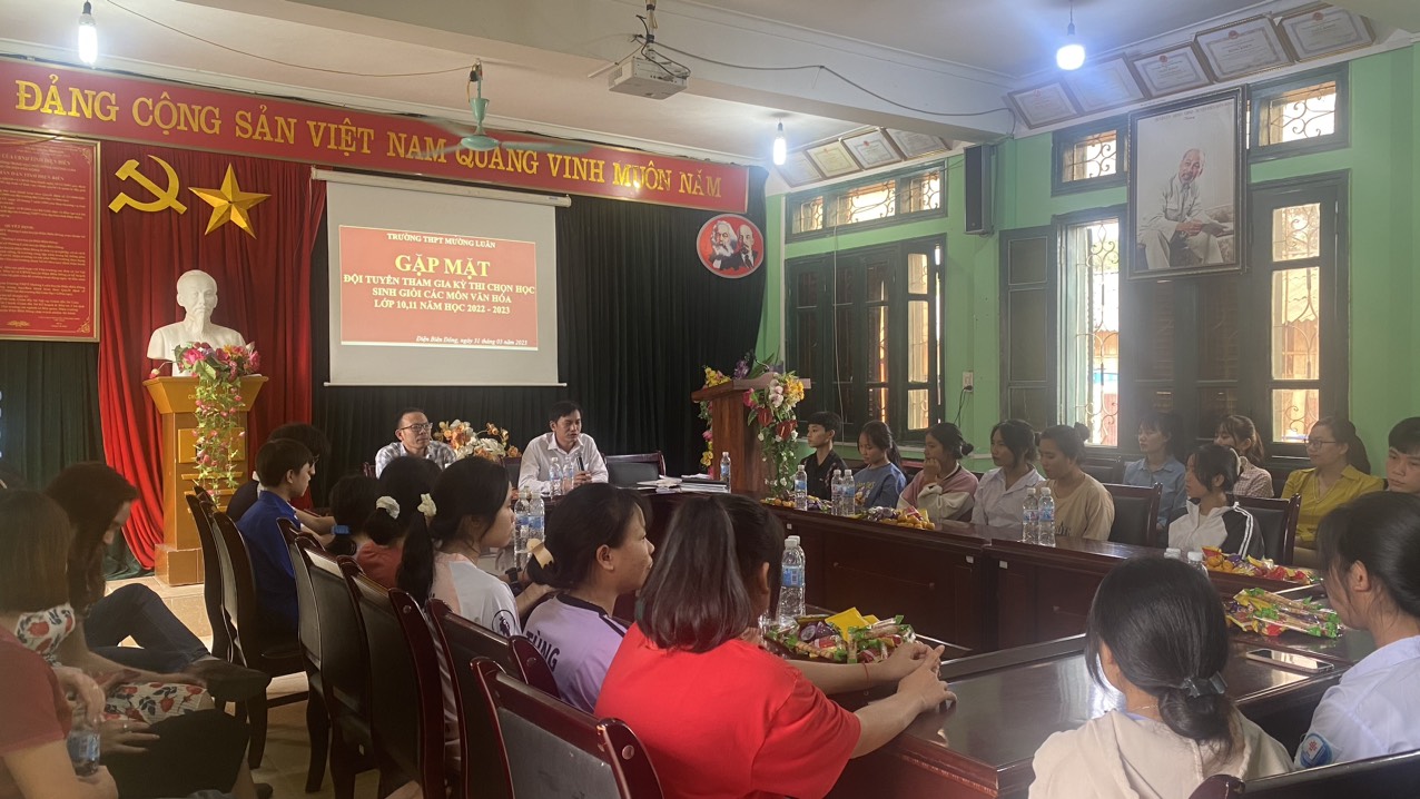 GẶP MẶT VÀ KHÍCH LỆ TINH THẦN HỌC SINHTHAM GIA KỲ THI CHỌN HSG CẤP TỈNH NĂM HỌC 2022 – 2023 Chiều ngày 31/03, tại phòng hội đồng, trường THPT Mường Luân đã tổ chức buổi gặp gỡ thân mật các giáo viên bồi dưỡng đội tuyển HSG khối 10, 11 và các đội tuyển tham dự kỳ thi chọn HSG cấp tỉnh năm học 2022 – 2023 nhằm động viên và khích lệ các em đạt thành tích cao trong kỳ thi. Ra quân trong kì thi học sinh giỏi năm nay trường THPT Mường Luân có 20 thí sinh tham gia với 8 môn thi là: Toán, lí, sinh, tiếng anh, văn, sử, địa và GDKTPL. Dự buổi gặp mặt có Thầy Trần Đình Quang –Bí thư chi bộ, Hiệu trưởng nhà trường; Thầy Hà Văn Tuân- phó bí thư chi bộ, phó hiệu trưởng;Thầy Vì Văn Dinh – Phó Hiệu trưởng nhà trường; Thầy Trần Danh Tú – Chủ tịch Công đoàn; Thầy Vì Văn Chuẩn – Bí thư Đoàn thanh niên; giáo viên trực tiếp bồi dưỡng cùng 08 đội tuyển tham gia kỳ thi chọn học sinh giỏi cấp tỉnh năm học 2022 – 2023