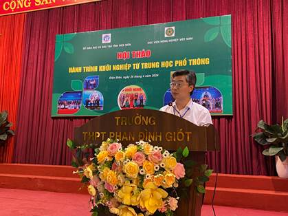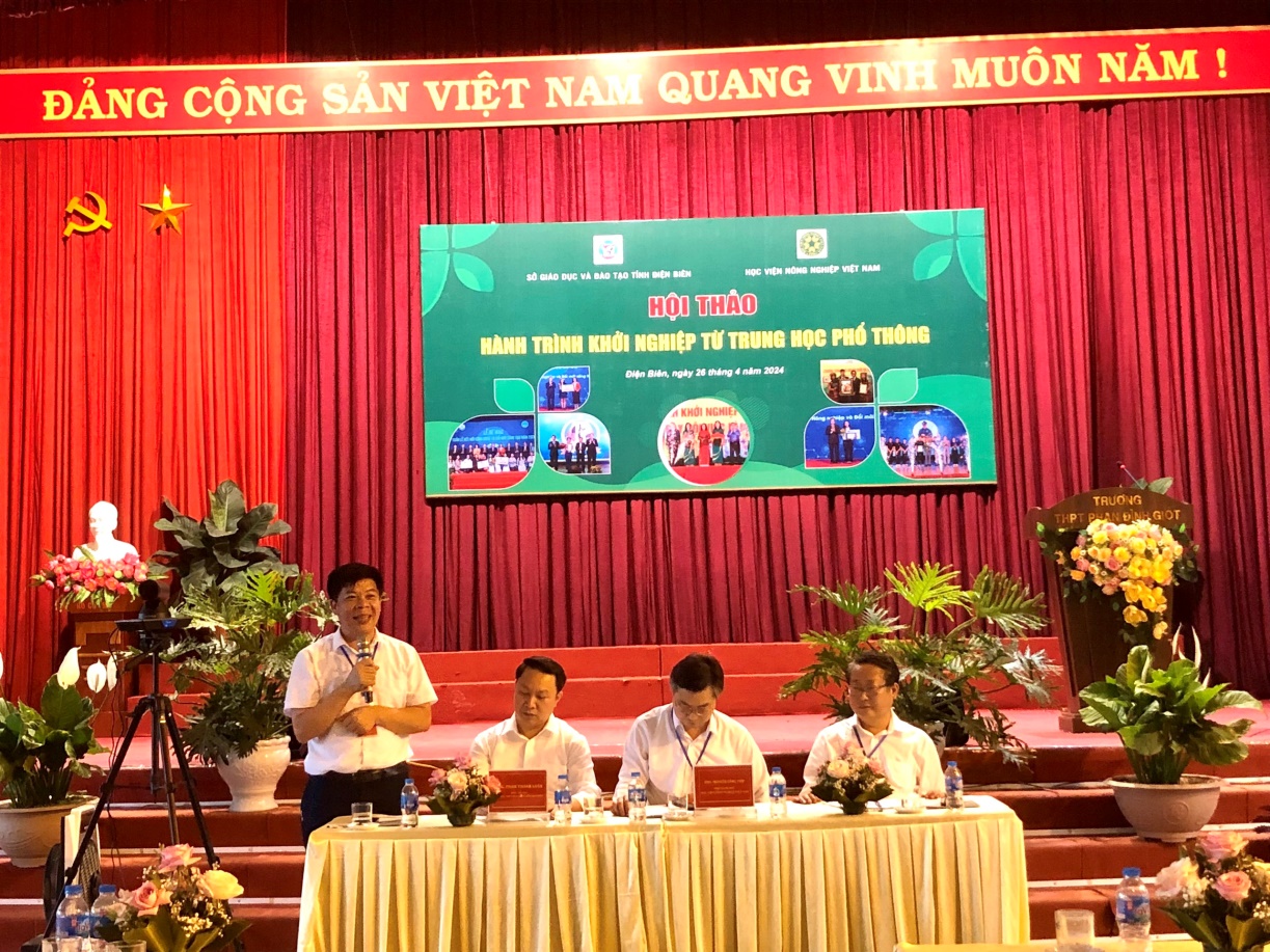 Sở Giáo dục và Đào tạo tỉnh Điện Biên phối hợp với Học viện Nông nghiệp Việt Nam tổ chức Hội thảo “Hành trình khởi nghiệp từ trung học phổ thông” năm 2024 Ngày 26/4/2024, Sở Giáo dục và Đào tạo tỉnh Điện Biên đã phối hợp với Học viện Nông nghiệp Việt Nam tổ chức Hội thảo “Hành trình khởi nghiệp từ trung học phổ thông” tại Trường THPT Phan Đình Giót với sự tham gia trực tiếp của gần 300 học sinh, thầy cô và sự tham gia trực tuyến trên nền tảng Zoom của 26 Trường THPT khác trên địa bàn tỉnh với đầu cầu zoom gồm giáo viên và học sinh các lớp khối 12. Hội thảo được tổ chức nhằm khơi dậy tinh thần, khát vọng khởi nghiệp trong giới trẻ; phát hiện, bồi dưỡng những học sinh có đam mê trong lĩnh vực khoa học công nghệ và; trang bị kiến thức, kỹ năng để học sinh THPT xây dựng, hiện thực hóa ý tưởng khởi nghiệp theo tinh thần Quyết định số 1665/2018/QĐ-TTg ngày 30/10/2017 của Thủ tướng Chính phủ và Quyết định số số 1230/QĐ-BGDĐT ngày 30/3/2018 của Bộ Giáo dục và Đào tạo về việc “Hỗ trợ học sinh, sinh viên khởi nghiệp đến năm 2025”.