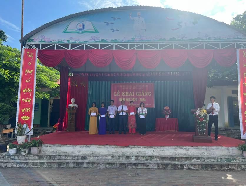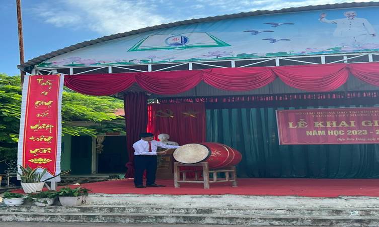 Ảnh: Thầy Trần Đình Quang- Hiệu Trưởng nhà trường lên đánh trống khai giảng Trong buổi lễ, Ban thường trực thi đua nhà trường lên thông qua các quyết định khen thưởng cho các tập thể, cá nhân đạt thành tích xuất sắc trong năm học 2022 – 2023. Cụ thể trong năm học 2022 – 2023, đơn vị trường THPT Mường Luân vinh dự được công nhận là tập thể Lao động Tiên tiến, có 4 cá nhân được công nhận đạt danh hiệu Chiến sĩ Thi đua Cơ sở, 27 cá nhân được công nhận là Lao động Tiên tiến, 2 cá được nhận giấy khen của Giám đốc Sở GD&ĐT.